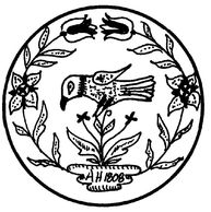 Also known as the double dove. Strength, courage and the heart in the center for love in marriage. Attributed to George Hubener 1786.